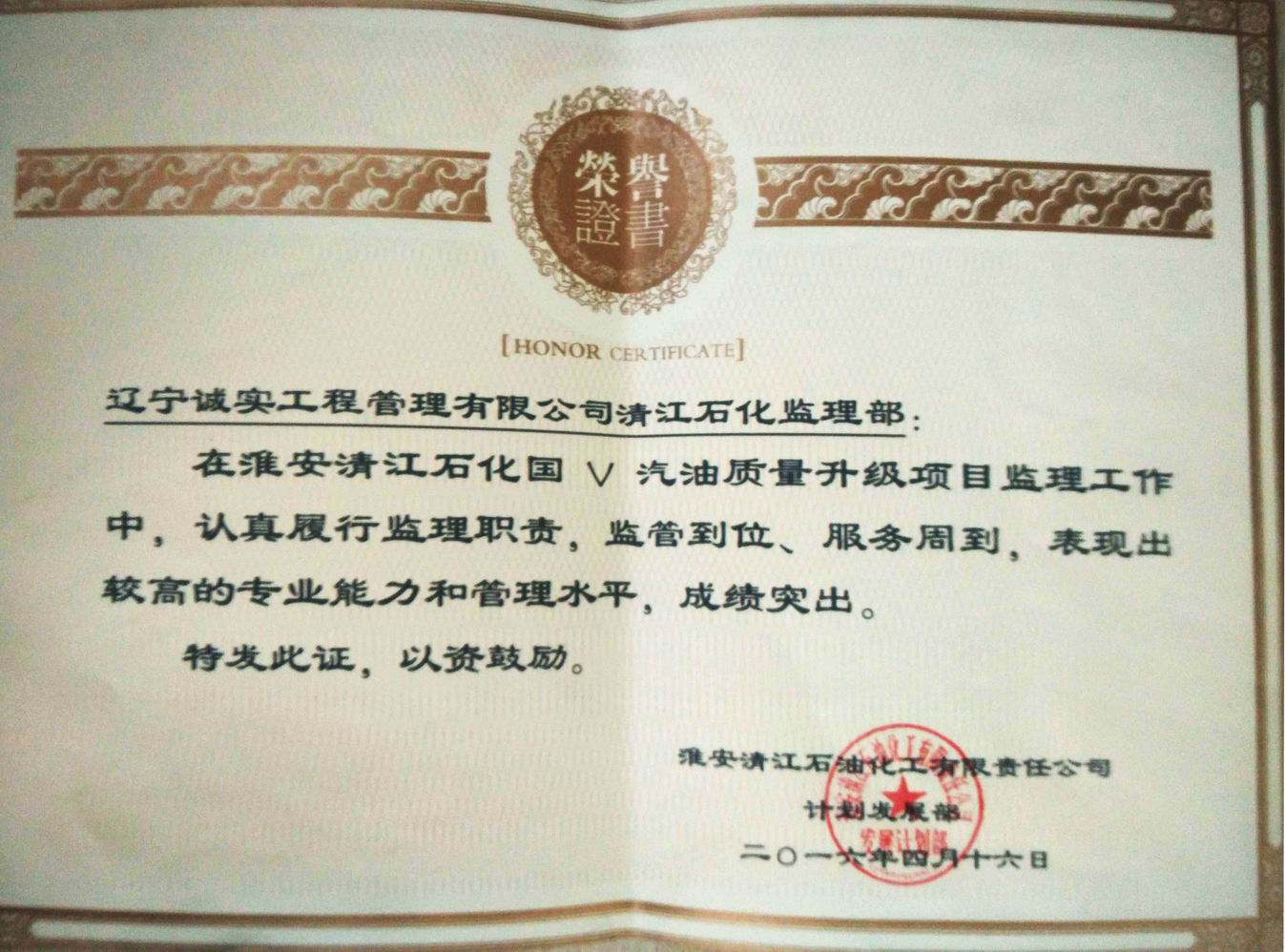 2016年淮安清江石化国V汽油质量升级项目奖状