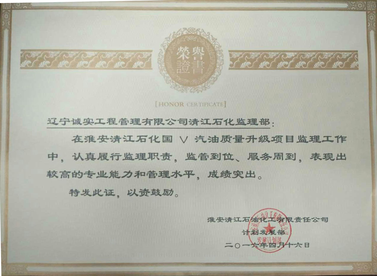 我公司监理人员在“中石化淮安清江石油化工有限责任公司国Ⅴ汽油质量升级项目”工程监理服务工作中,得到了建设单位的一致认可和肯定,对我们的工作表示十分满意,特发函提出表扬,并赠与荣誉证书、锦旗以资鼓励。