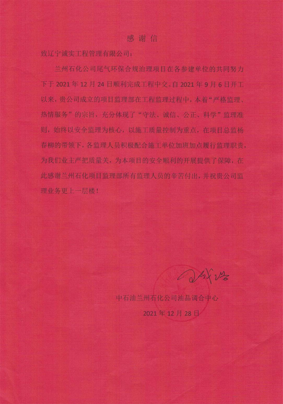 喜讯¦兰州石化公司尾气环保合规治理项目顺利完成工程中交-项目部收到业主单位感谢信