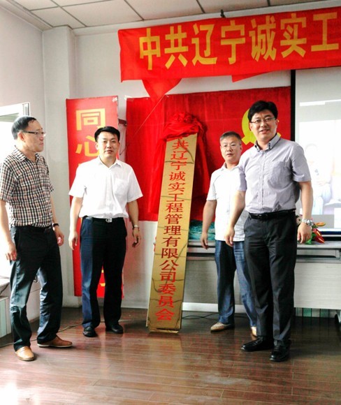 中共抚顺市委组织部领导李劲夫(右二)、中共新抚区委副书记罗玉生(左二)、新抚区委常委组织部长 隋淑贵(右一)、九州手机官方网站入口,九州(中国)董事长赵华(左一)为中共九州手机官方网站入口,九州(中国)委员会揭牌