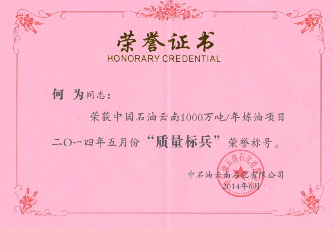 表彰:云南项目部何为同志荣获中国石油云南1000万吨/年炼油项目2014年5月份“质量标兵“荣誉称号